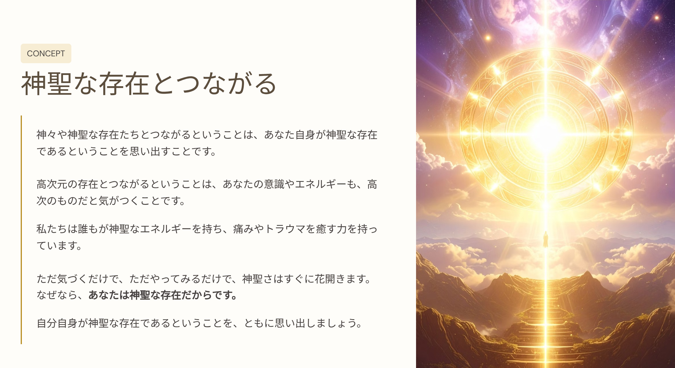 ハート(内側)から人生を創造する生き方をガイドし、ライトランゲージ・誘導瞑想・ヒーリングを通じて、一人ひとりの変容を丁寧に支えている。